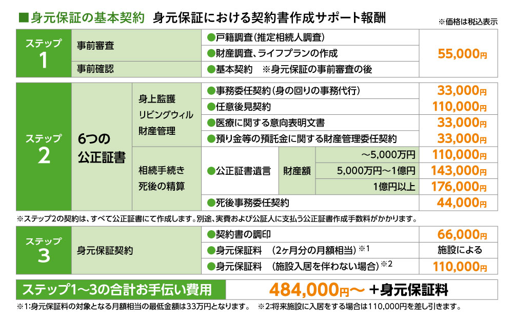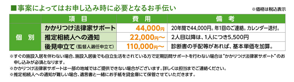 ・すぐに施設へご入居される予定がない方は、かかりつけ法律家サポート(4.4万円/20年間)にご加入いただきます。また、ご希望のタイミングにて推定相続人への通知を行います。(2.2万円〜)