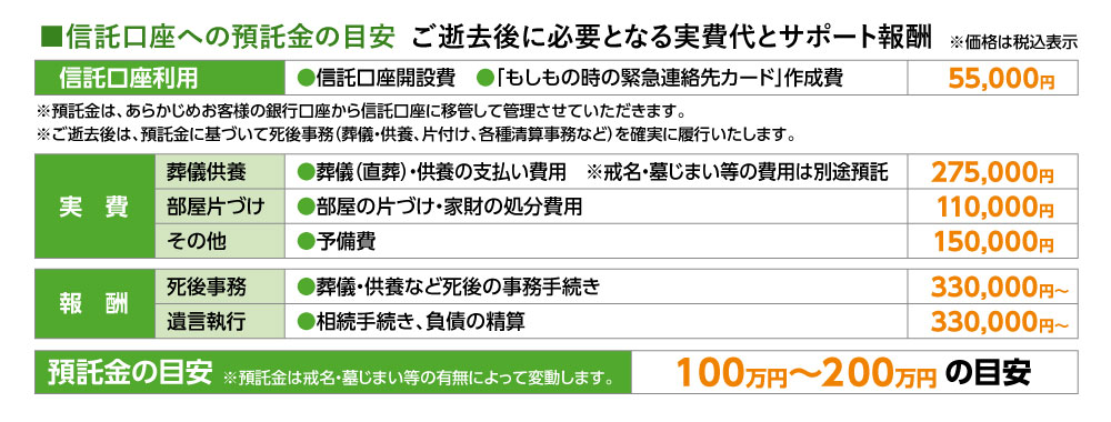 ・ステップ2にて、死後事務に関する準備金として、葬儀・供養費、家財道具処分費、死後事務履行費用、相続手続き費用をお客様の専用の信託口座にてお預かりします。