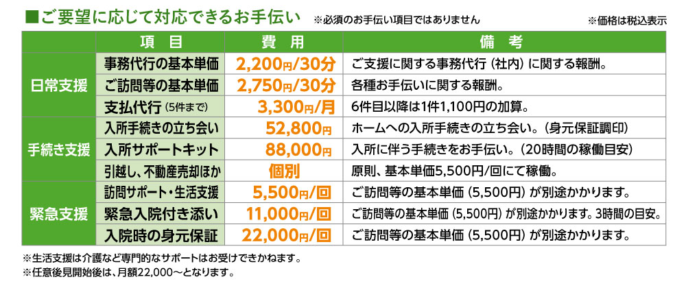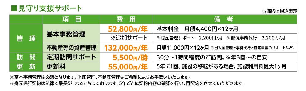 ・あんしん財産管理支援機構への登録と「もしもの時の連絡先カード」の発券および、精算時の監査料に別途1.76万円がかかります。